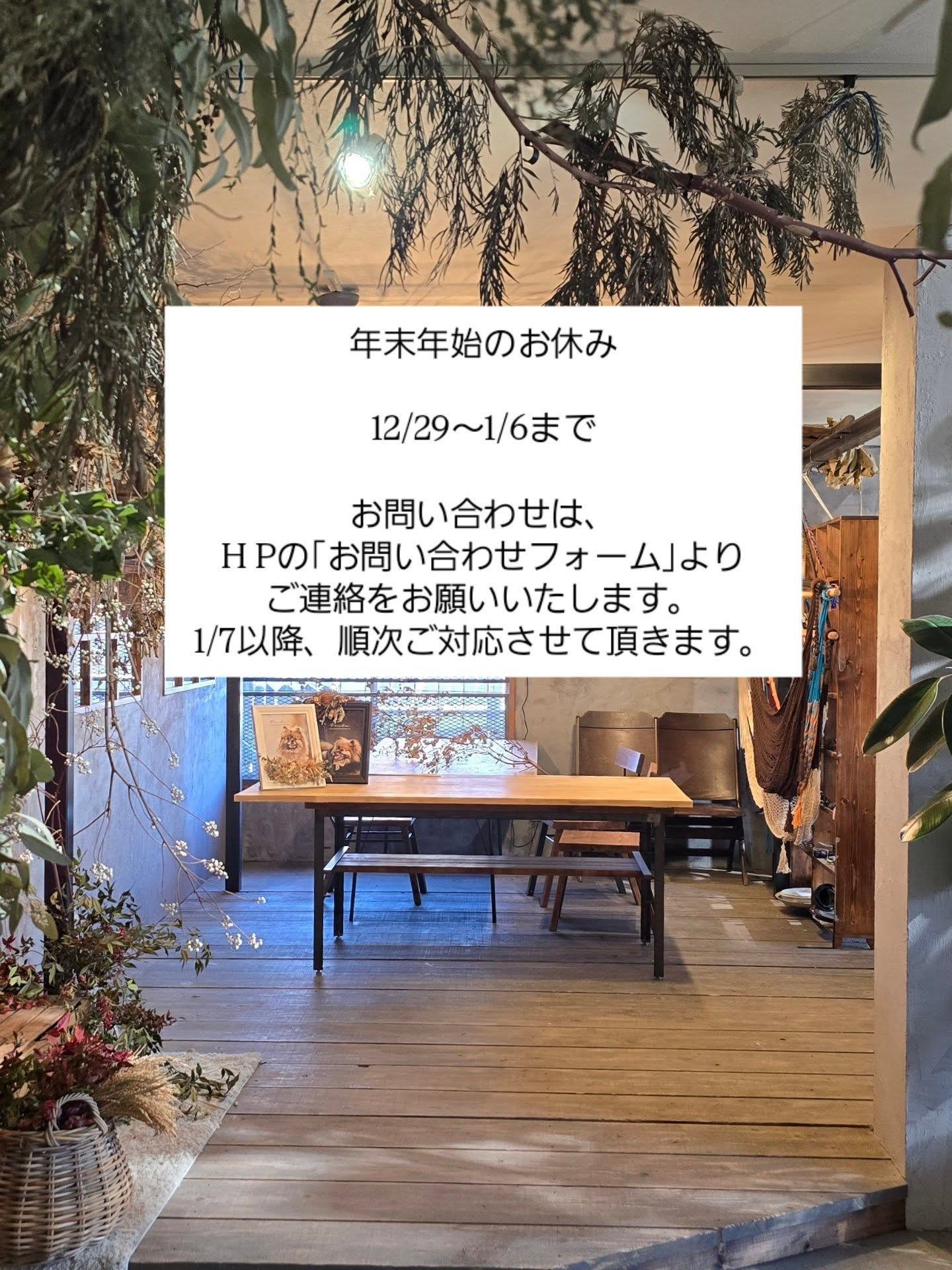 年末年始のお休み 2025/12/21 年末年始のお休み 12/29~1/6まで お問い合わせは、 H Pの「お問い合わせフォーム」より ご連絡をお願いいたします。 1/7以降、順次ご対応させて頂きます。
